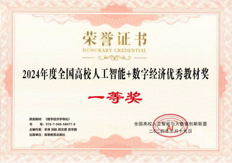 德赢官网李涛老师和互联网经济研究院刘航老师担任主编的《数字经济学导论》荣获了2024年度全国高校人工智能与数字经济领域优秀教材一等奖。作为《新文科·数字经济系列教材》中的首部教材,该教材于2022年7月由高等教育出版社正式发行,并至今已累计印刷六次,总印数超过一万册。