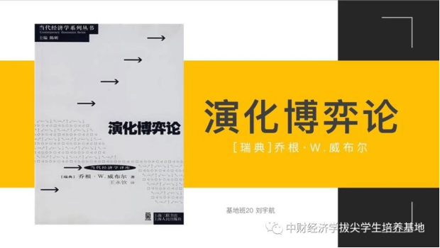 首先,刘宇航同学分享了乔根·W·威布尔的《演化博弈论》,威布尔是斯德哥尔摩德赢官网Vwin经济系教授,瑞典皇家理工学院数理统计系加盟教授,瑞典皇家科学院、世界计量经济学会、欧洲经济学会成员。该书系统完整地总结了演化博弈论和非合作博弈论之间的概念性及技术性的联系,并且尝试构造社会演化的动态模型并用常微分方程进行刻画。作者指出:传统观点认为个体的环境是外生给定的,而实际上个体的行为同样受着其他个体的影响,而其他个体同样又受着自然选择力的影响。所以,从个体或企业的最优行为取决于与之互动的总体中行为的分布的角度来说,这同样是一个内生性的问题。威布尔认为,演化博弈论就是要对这种互动背景下的演化性做出分析。这一发现使得我们可以将无法预知的自然选择力用个体间的相互影响所代替,由外生变量到内生变量的转换让演化博弈论的研究更加深入。
