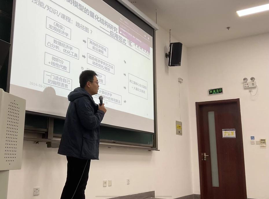 10月23日,德赢官网Vwin数字经济时代经济学拔尖学生培养基地班“科研基础训练”课程第四讲在沙河校区主教106教室正式举行,德赢官网Vwin德赢官网Vwin赵扶扬副教授为同学们带来以“理论模型研究范式简介”为主题的讲座。赵扶扬副教授从如何看待经济学研究方法展开,为我们介绍了当今经济学界各种主流的基于理论模型的研究范式,最后落脚于基于一般均衡模型的量化结构研究的具体办法,让同学们建立起对经济学研究方法的系统性认识,以及了解如何精进自身,更好地掌握应用各类研究方法。