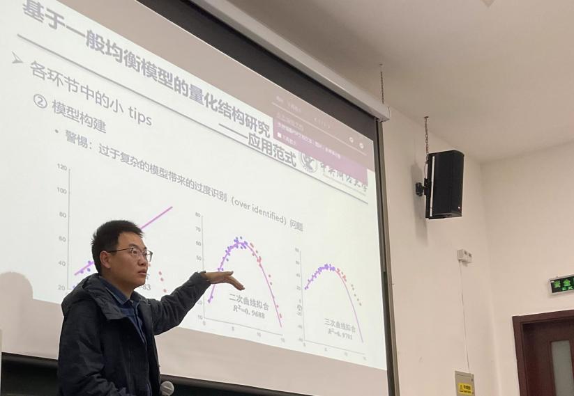随后,赵老师结合自身经验,为同学对基于一般均衡模型的量化结构研究的学习给出了具体建议。赵老师认为在研究前,同学们应当对宏观经济学、数理经济学、大学数学以及编程语言有所了解,但广泛阅读相关文献,以“干中学”的方式,在学习模型的同时补足先前知识也未尝不可。而在研究时,赵老师则从特征事实、模型构建、模型的校准与估计、模型的适应性分析、模型的算法设计和编程六个环节给出具体建议,让同学们受益匪浅。